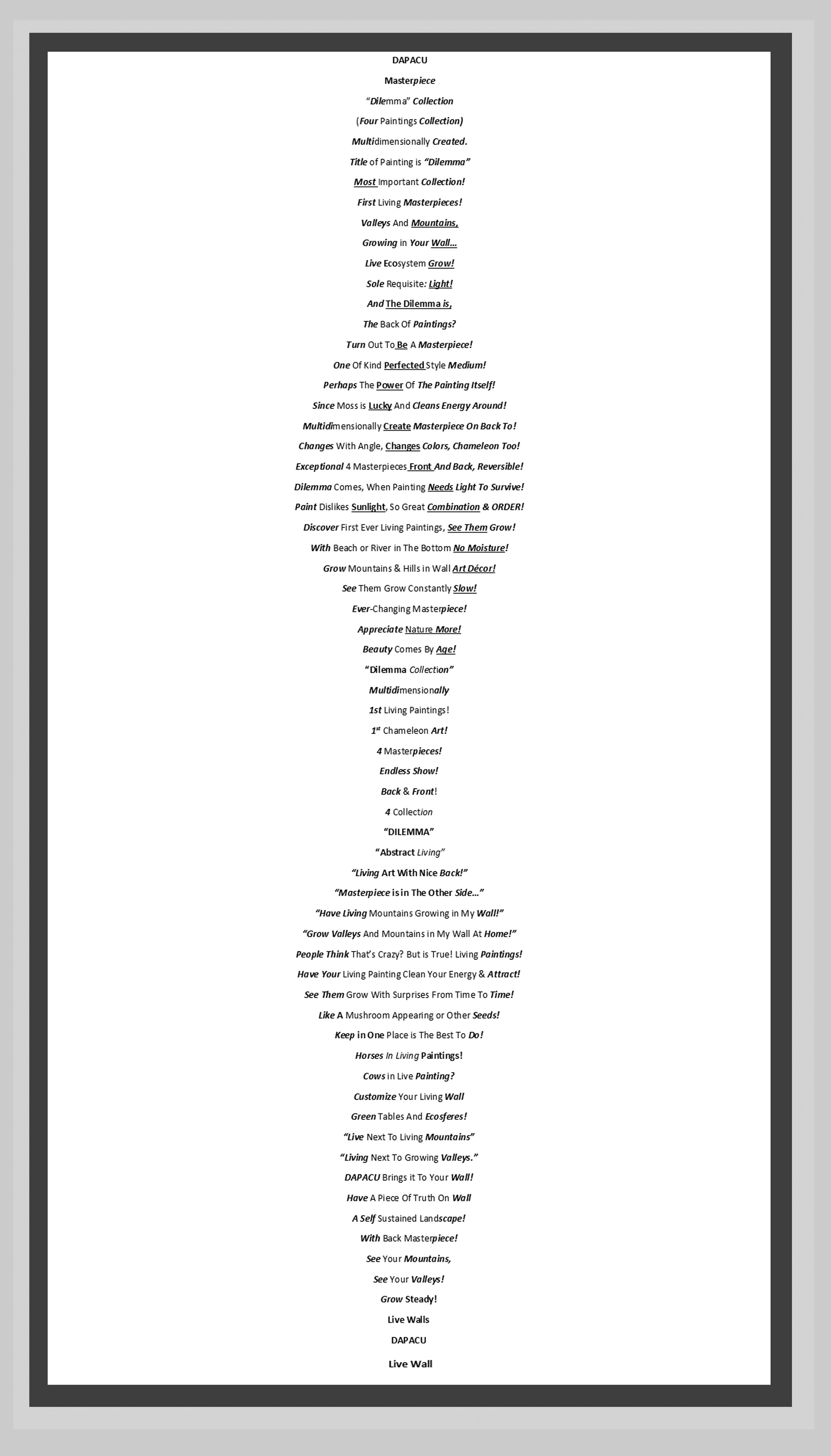 DAPACU Masterpiece “Dilemma” Collection (Four Paintings Collection) Multidimensionally Created. Titleof Painting is “Dilemma” Most Important Collection! First LivingMasterpieces! ValleysAnd Mountains, Growing in Your Wall… Live Ecosystem Grow! Sole Requisite:Light! AndThe Dilemma is, The Back Of Paintings? Turn Out To Be A Masterpiece! One Of Kind Perfected Style Medium! Perhaps The Power Of The Painting Itself! Since Moss is Lucky And Cleans Energy Around! Multidimensionally CreatedMasterpiece On Back! Changes With Angle, ChangesColors, Chameleon Too! Exceptional4 Masterpieces Front And Back, Reversible! Dilemma Comes, When Painting Needs Light To Survive! Paint Dislikes Sunlight, So Great Combination & ORDER! Discover First Ever Living Paintings, See Them Grow! With Beach or River in The Bottom No Moisture! GrowMountains & Hills in Wall Art Décor! SeeThem Grow Constantly Slow! Ever-Changing Masterpiece! AppreciateNature More! Beauty Comes By Age! “DilemmaCollection” Multidimensionally 1st Living Paintings! 1st Chameleon Art! 4 Masterpieces! Endless Show! Back & Front! 4 Collection “DILEMMA” “Abstract Living” “Living Art With Nice Back!” “Masterpiece is in The Other Side…” “Have LivingMountains Growing in MyWall!” “Grow ValleysAnd Mountains in My Wall AtHome!” People ThinkThat’s Crazy? But is True! LivingPaintings! Have YourLiving Painting Clean Your Energy &Attract! See ThemGrow With Surprises From TimeTo Time! Like A Mushroom Appearing or OtherSeeds! Keep in One Place is The BestTo Do! HorsesIn Living Paintings! Cowsin Live Painting? CustomizeYour LivingWall Green Tables And Ecosferes! “Live Next To Living Mountains” “Living Next To Growing Valleys.” DAPACU Brings it To Your Wall! Have A Piece Of Truth On Wall A Self Sustained Landscape! With Back Masterpiece! See Your Mountains, See Your Valleys! GrowSteady! Live Wall DAPACU Arte.Art